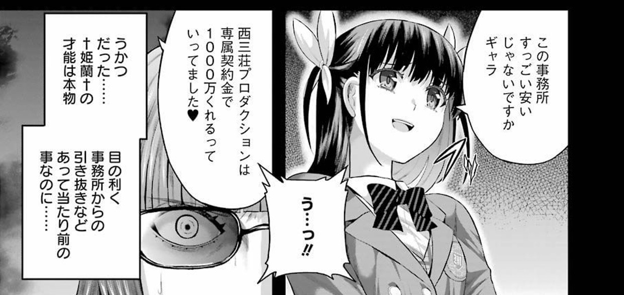 とりあえず一週間だけ保留にさせて金銭を工面しようとする†姫蘭†でしたが、弱小プロダクションでは人間に投資するだけのお金は持たず……というか、そもそも借金を抱えてしまっているのでそれどころではなかった。