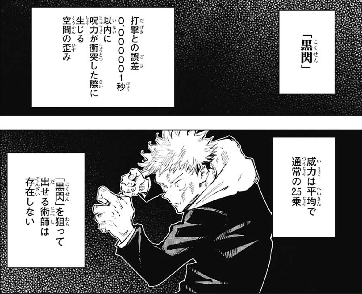 そして、決めなければいけないと言う「黒閃」とは、なんだか凄い誤差も許されないほどのぴったりのタイミングで呪力と打撃が同時に衝突しなければ不可能だと言う技らしい。