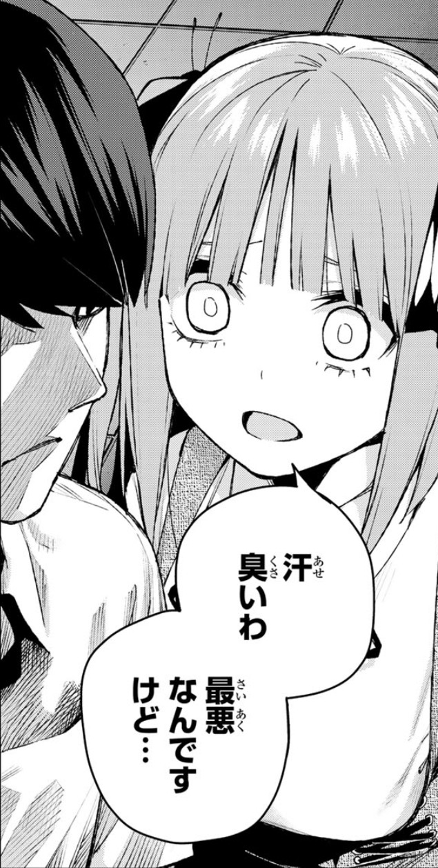 二乃の態度がそういう作戦だったという事はつまり今回の毒の強い発言の数々は本心からのものではなかったという事。出会い頭に「汗臭い」と真っ白い目を向ける二乃でしたがもちろんそうは思っていないはず。