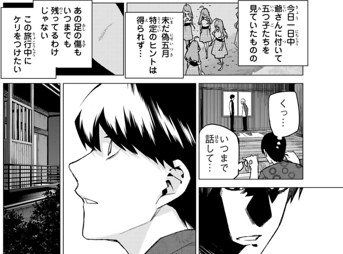 引き止め工作を頼んでいたはずが放置されてしまった二乃……。これが前回ラストの驚きのエンカウントへ繋がるのかとは思いますが、今回二乃の出番が全くないためにどうなったのかはわかりません。温泉にでも行ってたとでも言えば誤魔化しの効きそうな一花と四葉と違い、こっぴどく怒られる羽目にはなるんでしょうが……。