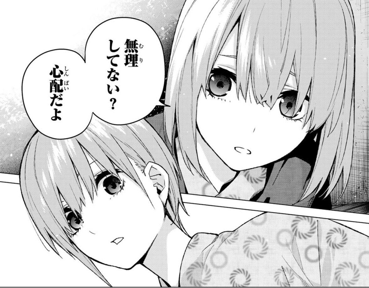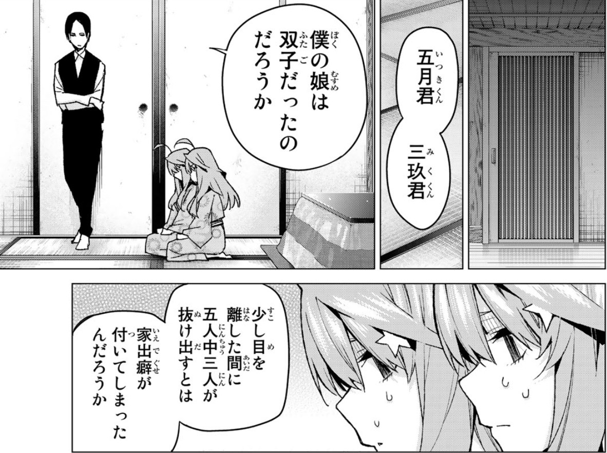 他の姉妹が夜中に部屋を出てしまったせいで残された三玖と五月は2人して父親に怒られてしまいます。