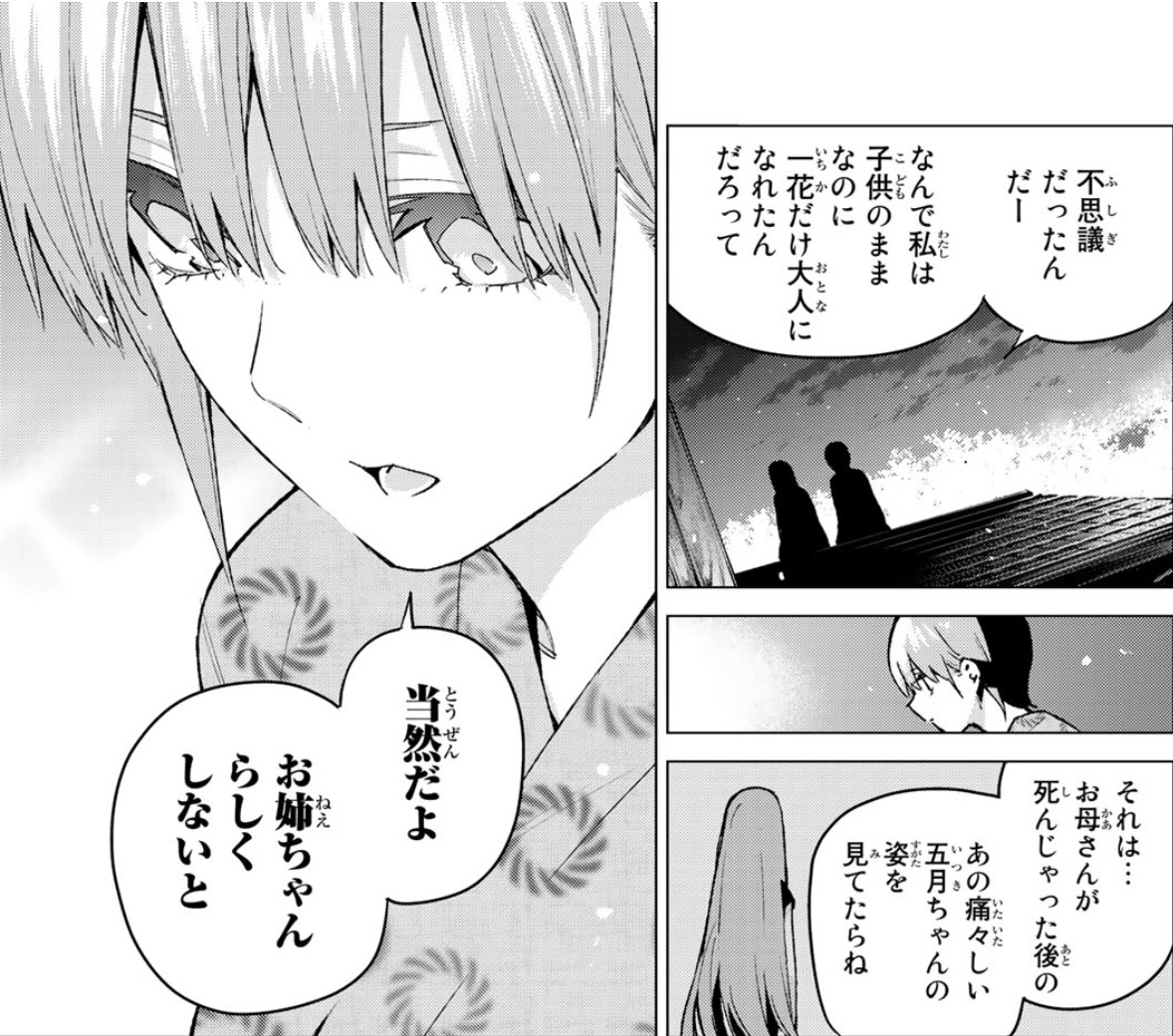 そんなにやんちゃだった一花が今のようなお姉ちゃんな性格になれたのはお母さんの死があったからだとか。