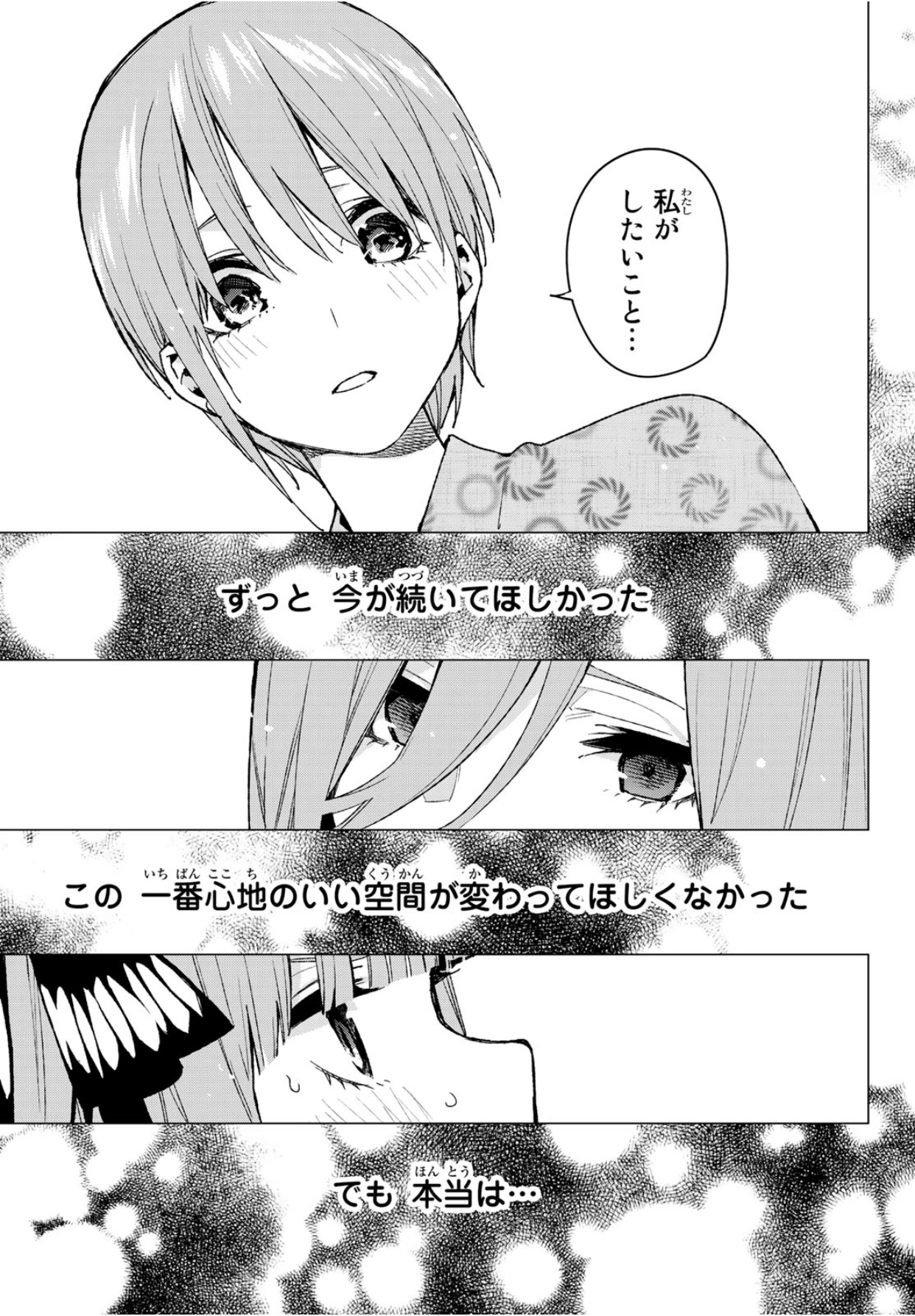 「もしかしたらフータローのところに……」と疑問を口にする三玖を否定する五月でしたが、偽五月の介入のせいで失敗してしまったとはいえ約束をしていた五月は心中ではなんとも言えず。