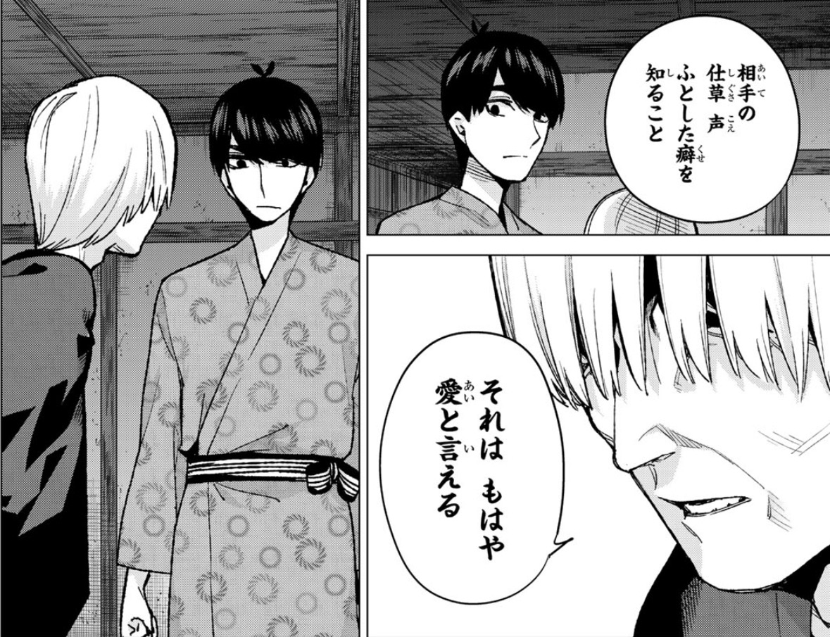 四葉と一花、三玖と五月、お爺ちゃんと風太郎が出会っていますが前回の引きで父親に見つかってしまった二乃はどうなったんでしょうか……。