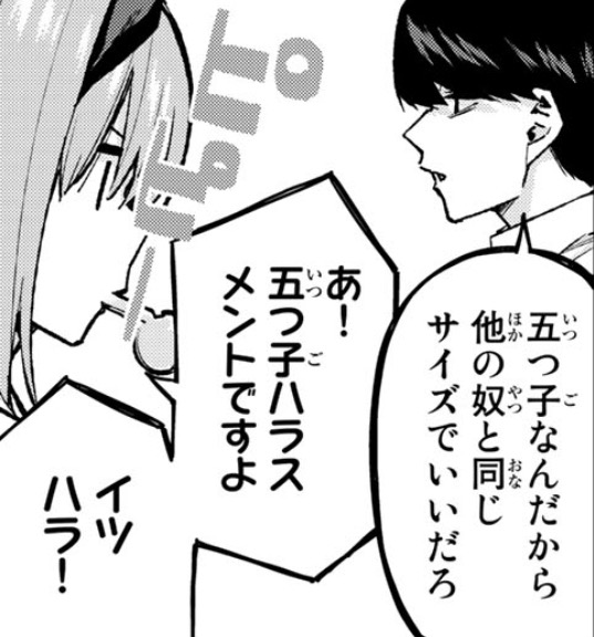 五月が採寸をすることに対して物凄く四葉に失礼な事を言ってしまっている気がするフータローでした。残念ながら四葉はぺったんこすぎるので他の姉妹の下着は合わないという事実は隠しておかねば……。