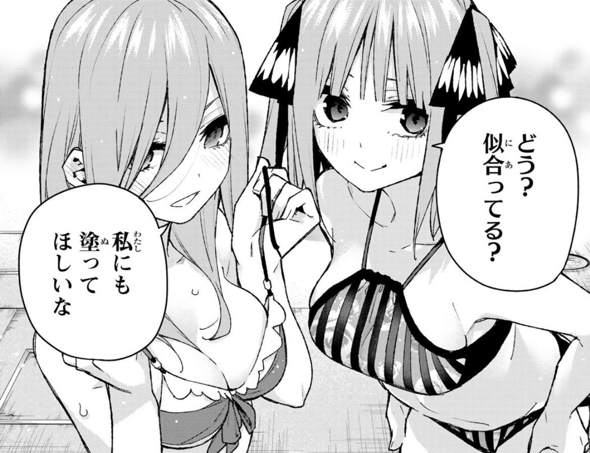 風太郎に会わせたら何が起きてしまうのかわからないとトラブルを懸念する五月でしたが、まさか風太郎からプールに誘ってくるなんて……という感じで終わった前回。中野家の五人姉妹たちの水着姿が予想以上に良かったです。