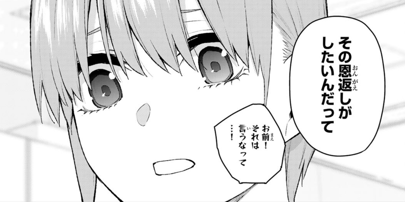 一度は家庭教師を辞めてしまった風太郎を再び雇い直せた事に対する感謝の気持ちに加えて今しかできない事を一花を含めた全員でしたいとの想いを秘めていた風太郎。