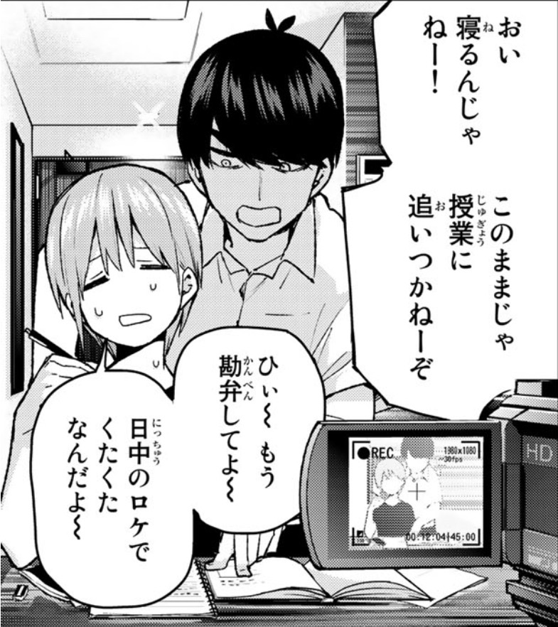 風太郎はそのための口実として一花を生徒役にした自主制作映画を撮る事になり実際にビデオカメラでの撮影を行っています。普通に考えて撮影した映画を披露する一番のチャンスってどこなのだろう……と考えてみたときにそれって結婚式での新郎新婦の馴れ初めを紹介するのに使える気がしませんか?