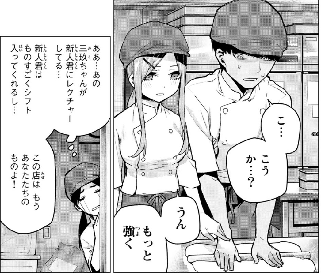 最初は真っ黒焦げで石だか炭だか見分けもつかないパンを作っていた三玖が後輩に教えている様を見たら店長ならずともホロリと来てしまいそうですね。「この店はあなたたちのもの」とはパン屋の店長の心の中の言葉ですが三玖推しとしては将来的にそうなってくれると面白いなという気がします。