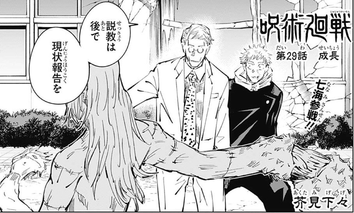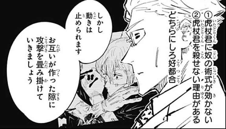 鼻血を出している真人の様子を見て状況を整理している七海は悠仁が彼に有効打を与えられることと触っても変形させられない事を確認し、状況を整理。実は魂の中身を触ったら宿儺にガン飛ばされたから1でもあるし、夏油に念を押されているから2でもあるという……。