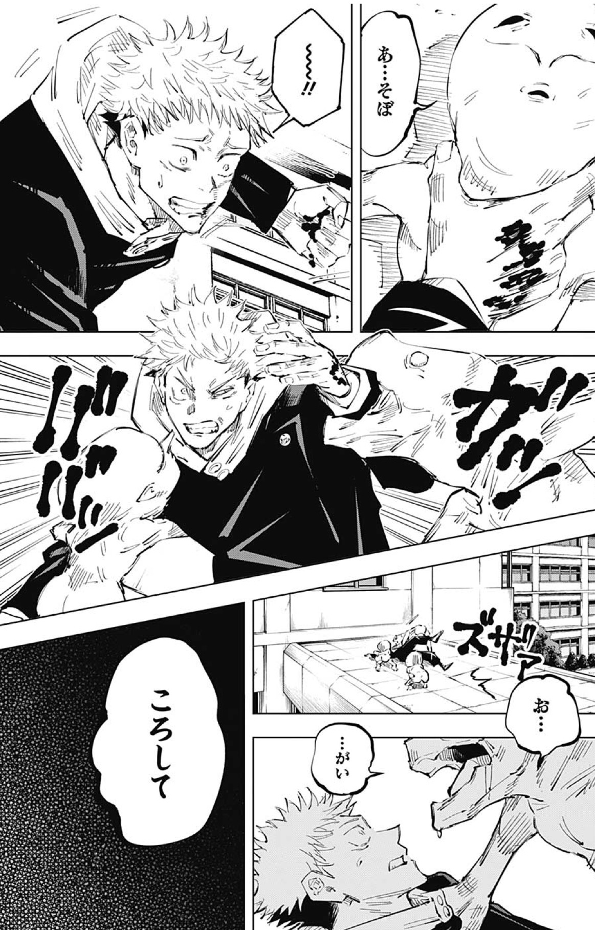 魂の形を変えられてしまったとはいえ「人間を殺せないだろう」と言う真人の思惑に対して、改造人間から殺してほしいと懇願されてしまった悠仁はなんとも悲しそうな表情をしています。