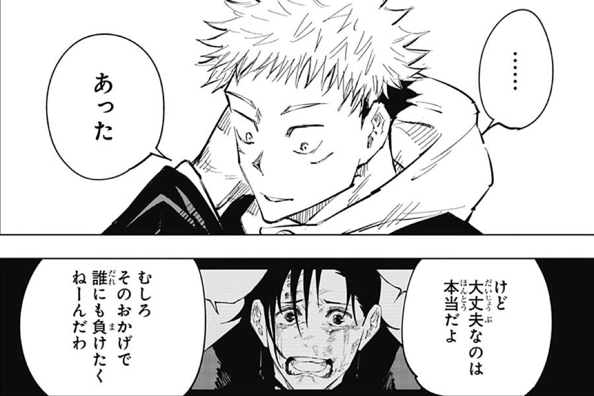 何かを察していた感じの伏黒に虎杖は声をかけられ、一度は誤魔化そうとするも何かあったけど大丈夫なのは本当だと返事をします。やっぱり先の一件は虎杖の中でシコリとなって残りそうですね。