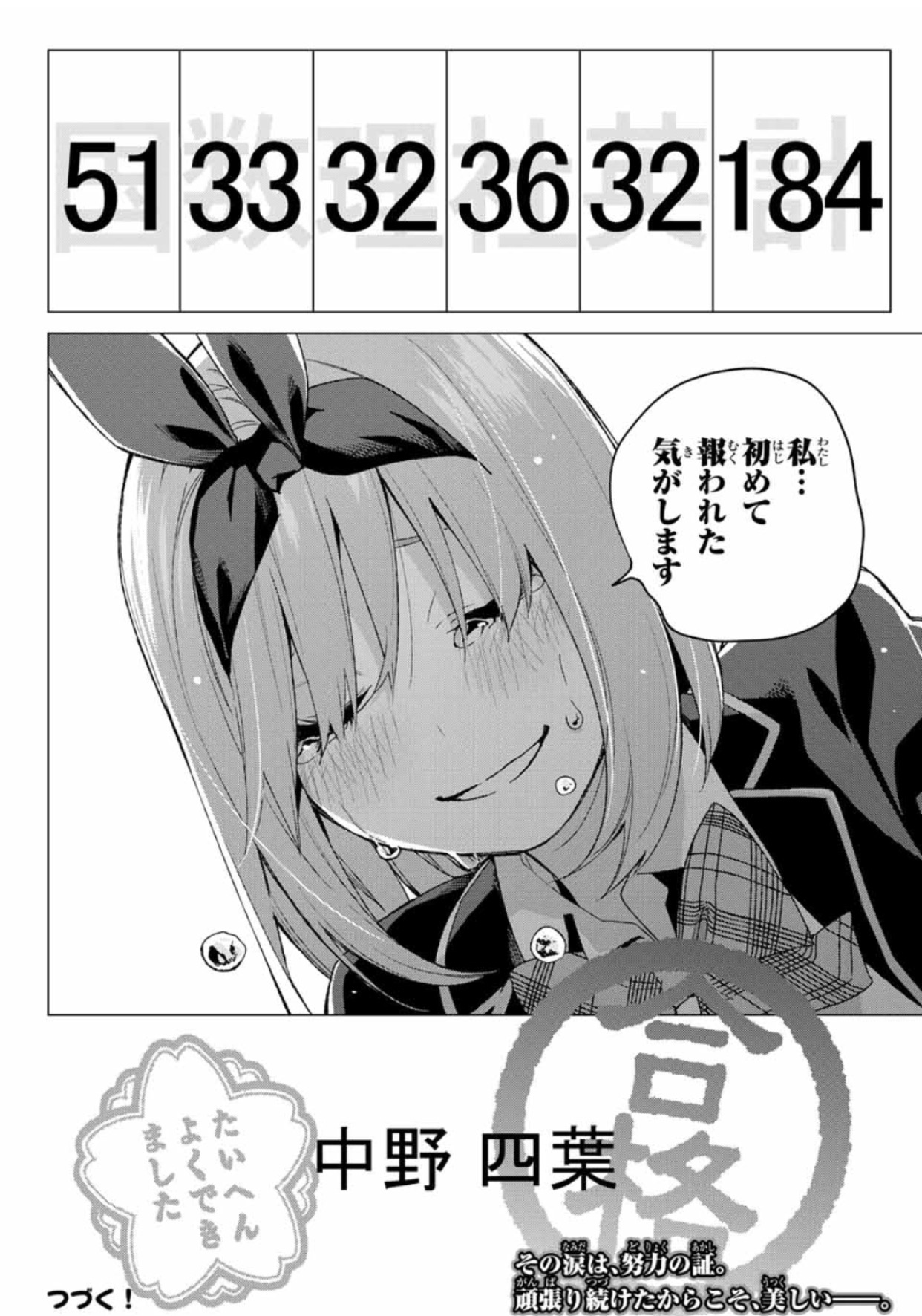 しかし、前回の成績からしたら合計で50点以上増えてる四葉の成績の上がりっぷりもなかなかのものです。作中で国語を教えていくのだと風太郎に言われていましたが、前回時点では五つ子の中で国語の成績が一番良かったのってさりげに五月だったんですね。