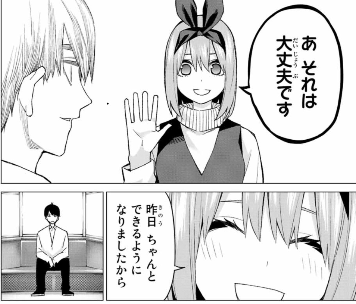 そんなエピソードを打ち明け勉強をさせて欲しいと懇願する四葉に「休日だって言ったろ」とたしなめつつ残りの半周でマンツーマン授業をしようとする風太郎は昨日教えきれなかった国語の問題のリベンジに挑みます……と思ったらすでに四葉は克服していた!