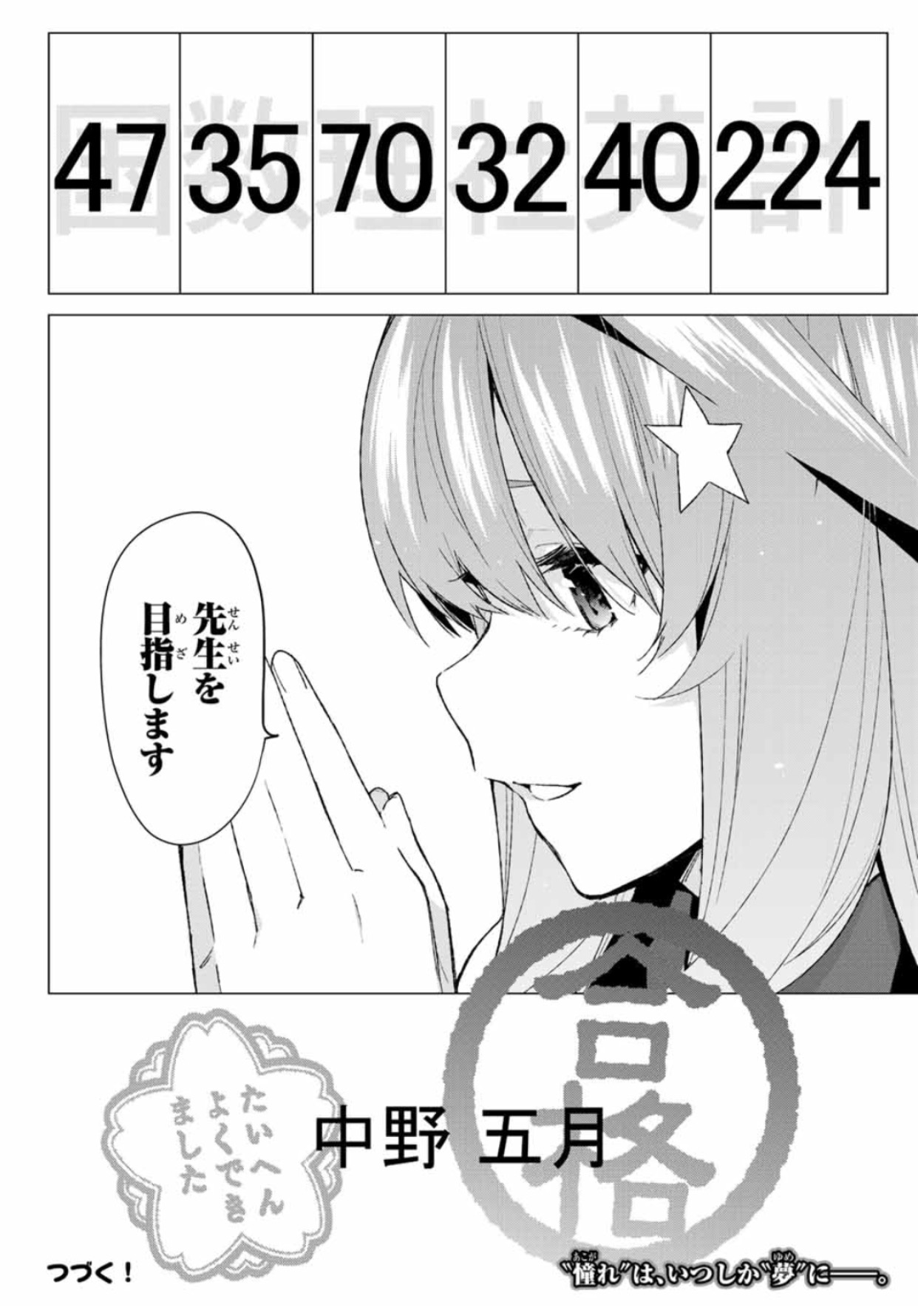 一ヶ月が過ぎて再び訪れた月命日に風太郎もその場を訪れていた。教わる事以上に教える事で咀嚼できることもあると五月は風太郎に感謝し、勉強を教えた相手に感謝される気持ちを問う。