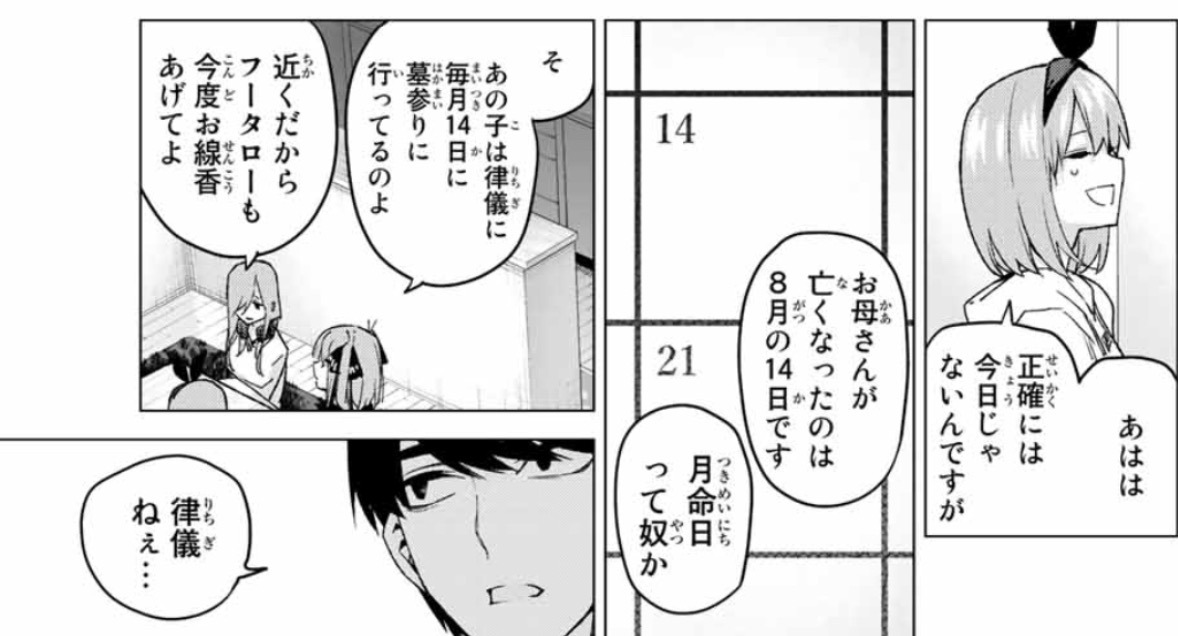 それは女の子の……ではなく、五つ子の母親の月命日だった。律儀な彼女は毎月の命日には母親の墓参りへと向かうのだというが、風太郎はその理由は果たして本当にそれだけなのか訝しんでいた。