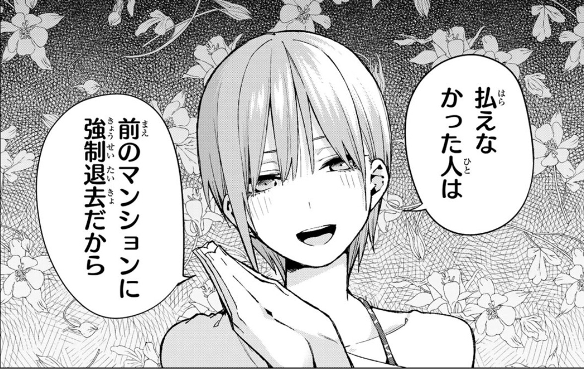 いよいよ進級を前にして一花は家賃を来週から他の姉妹にも五等分して払ってもらうと宣言。当たり前といえば当たり前なんですが、一花の笑顔が怖すぎる……。