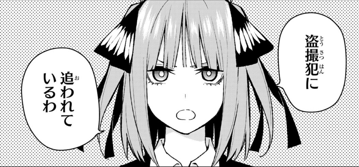 諸注意の際のカシャンもそうなのですが、誰か五つ子の後を付けて写真を取っている人がいるらしい。二乃はその事で過敏になりすぎて、料理の写真を撮ろうとしている他の女子高生のシャッター音にも反応してしまうほど。