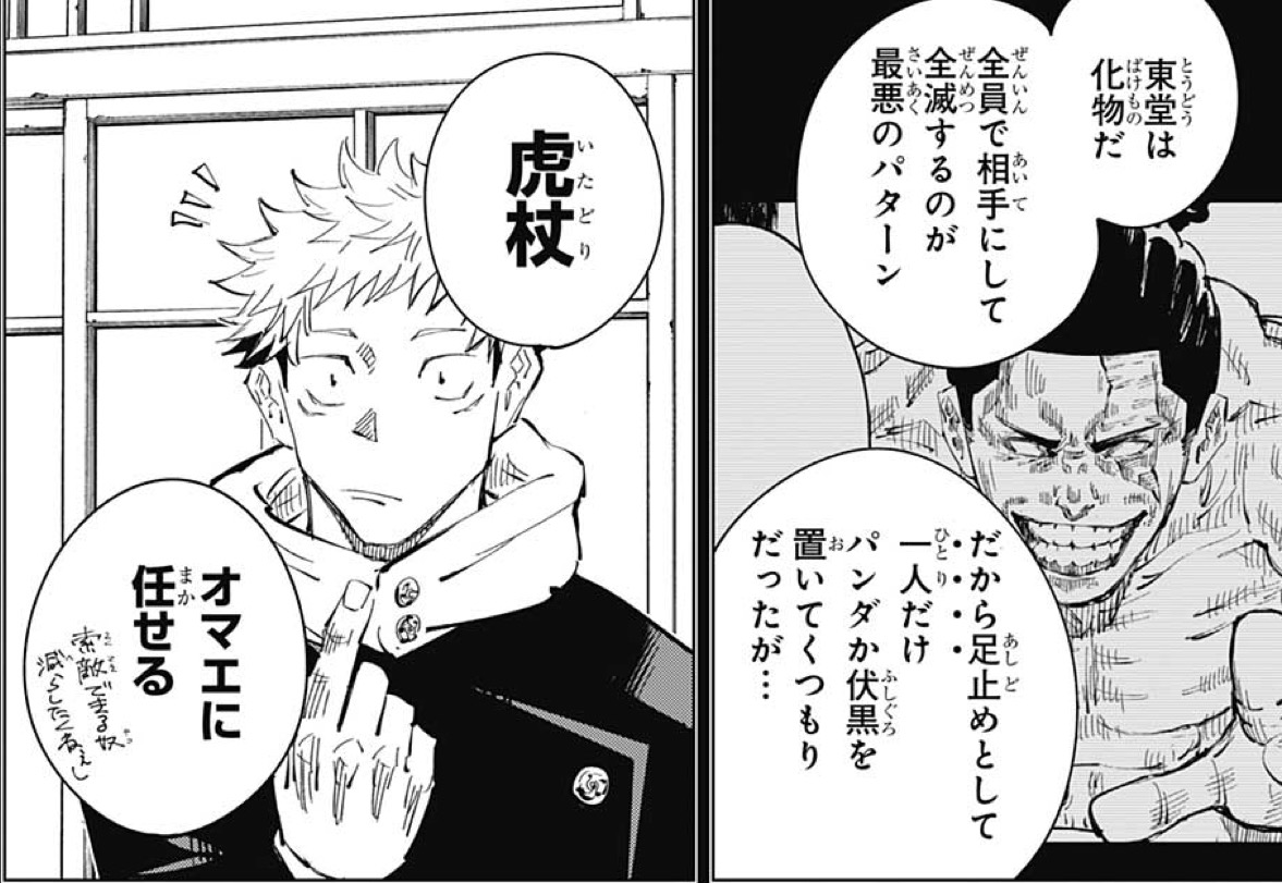 百鬼夜行の際も影で活躍していたらしい東堂はお返しに力強い一撃からの連続攻撃で虎杖をボコボコにしてしまいます。勝ちを確信していた東堂でしたが、そう簡単にはいかないほどしぶといのが我らの虎杖です。