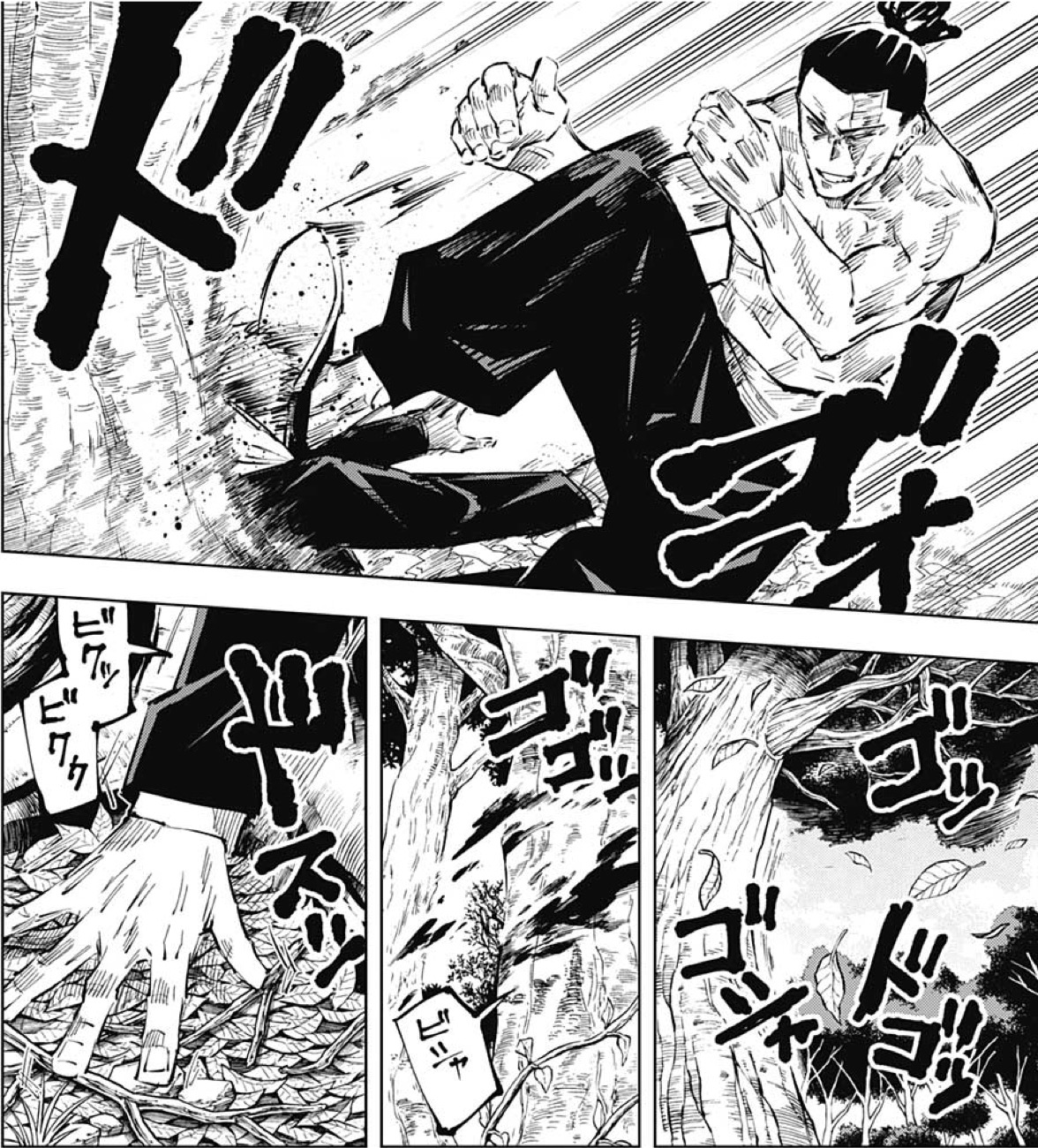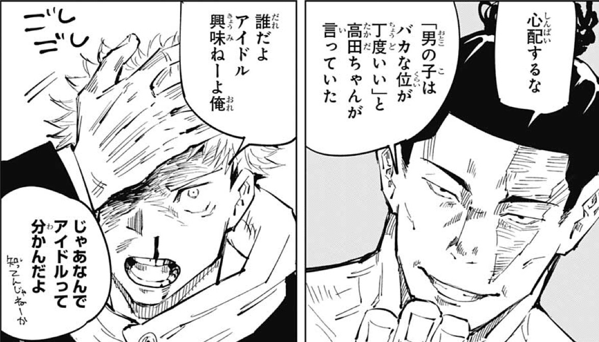 立ち上がって冗談を飛ばす元気があるほどには余裕がありそう。それに対して真剣にボケる東堂と虎杖の切り返しの絶妙なニュアンスが良い。
