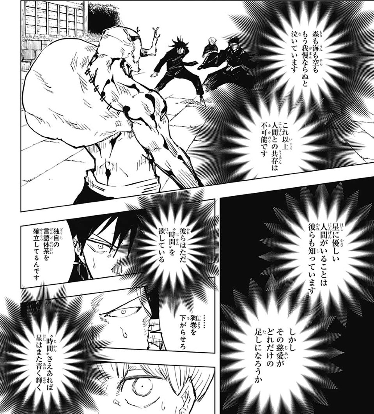 「一人でも死んだら僕らの負け」という五条の言葉が重くのしかかりますね。長かった感はあるとはいえ、それぞれの事情を描いたこれまでの展開のおかげで京都勢にも死んで欲しくはないです。